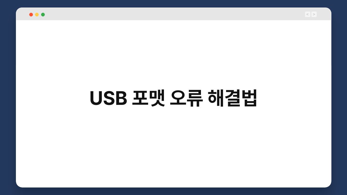 USB 포맷 오류는 누구나 한 번쯤 겪어본 일입니다. 갑자기 USB가 인식되지 않거나 포맷할 수 없다는 메시지를 받으면 당황스럽죠. 하지만 걱정하지 마세요. 이 글에서는 USB 포맷 오류를 해결하는 다양한 방법을 소개해 드리겠습니다. 간단한 팁부터 전문적인 방법까지, 여러분의 문제를 해결할 수 있는 유용한 정보를 제공할게요. 끝까지 읽어보시면 USB 문제를 손쉽게 해결할 수 있습니다.