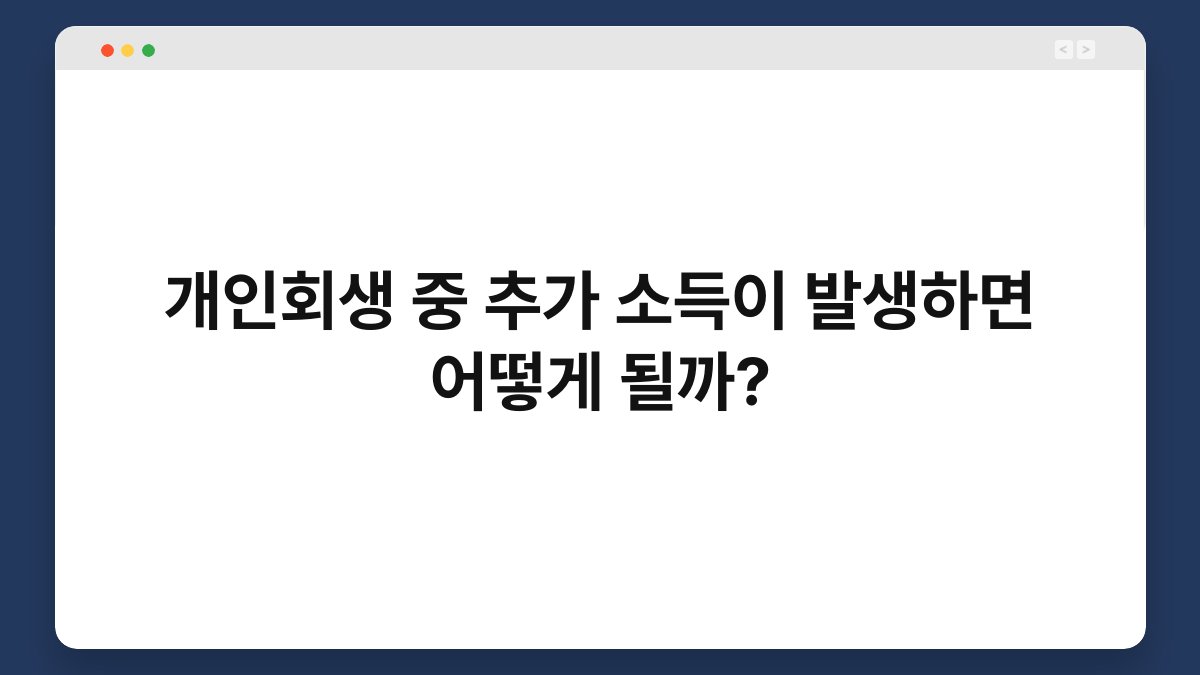 개인회생 중 추가 소득이 발생하면 어떻게 될까요? 많은 분들이 이 질문을 가지고 계실 텐데요. 개인회생 절차는 재정적 어려움에서 벗어나기 위한 중요한 방법입니다. 하지만 이 과정에서 추가 소득이 생긴다면, 어떻게 처리해야 할지 막막할 수 있습니다. 이번 글에서는 개인회생 중 추가 소득이 발생했을 때의 대처 방법과 그에 따른 영향에 대해 자세히 알아보겠습니다.