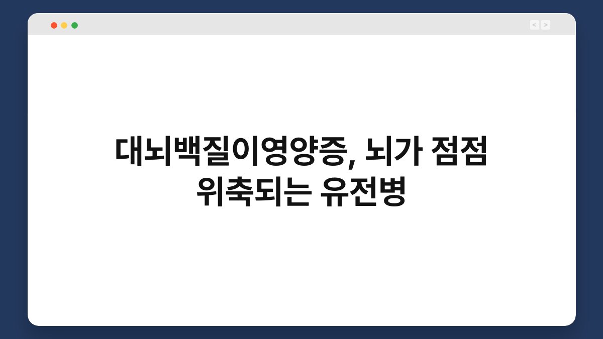 대뇌백질이영양증은 유전적인 요인으로 인해 발생하는 질환으로, 뇌의 백질이 점차적으로 손상됩니다. 백질은 뇌의 신경 세포를 연결하는 역할을 하며, 정보 전달에 매우 중요한 역할을 합니다. 이 질환은 대개 어린 시절이나 청소년기에 발병하며, 환자의 뇌 기능에 심각한 영향을 미칠 수 있습니다. 이럴 때, 가족과 환자는 많은 어려움을 겪게 되죠.
