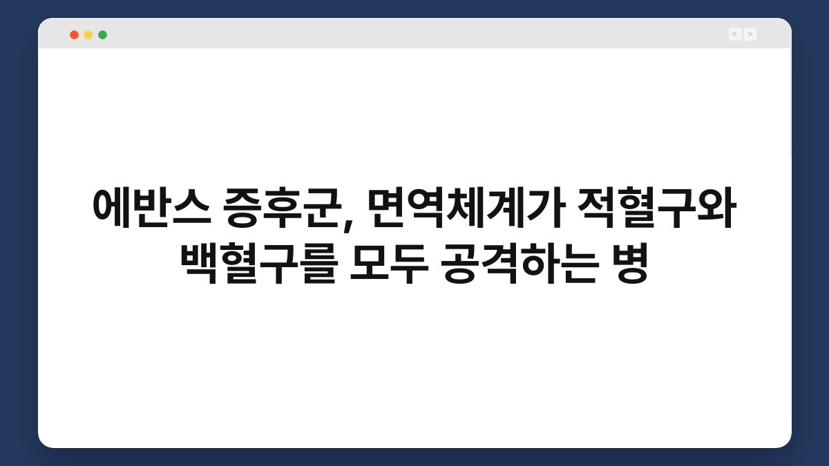 면역체계가 적혈구와 백혈구를 동시에 공격하는 에반스 증후군, 들어보셨나요? 이 질환은 우리 몸의 방어 시스템이 오히려 자신의 세포를 공격하는 이상 현상을 초래합니다. 많은 사람들이 이 증후군에 대해 잘 알지 못하지만, 그로 인해 발생할 수 있는 여러 증상과 치료 방법에 대해 알아보는 것이 중요합니다. 이번 글에서는 에반스 증후군의 원인, 증상 및 치료 방법을 깊이 있게 살펴보겠습니다. 함께 알아보시죠.