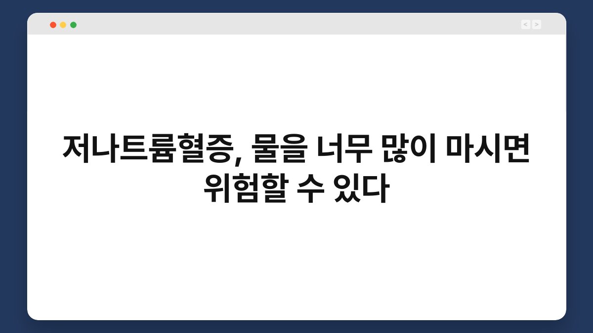 물은 생명에 필수적인 요소이지만, 과도한 수분 섭취는 오히려 건강에 해로울 수 있습니다. 특히 저나트륨혈증이란 상태는 물을 너무 많이 마셨을 때 발생할 수 있는 위험한 상황 중 하나입니다. 이 글에서는 저나트륨혈증의 원인과 증상, 이를 예방하는 방법에 대해 알아보겠습니다. 건강한 수분 섭취에 대한 이해를 높여, 안전한 생활을 영위할 수 있도록 도와드릴게요.
