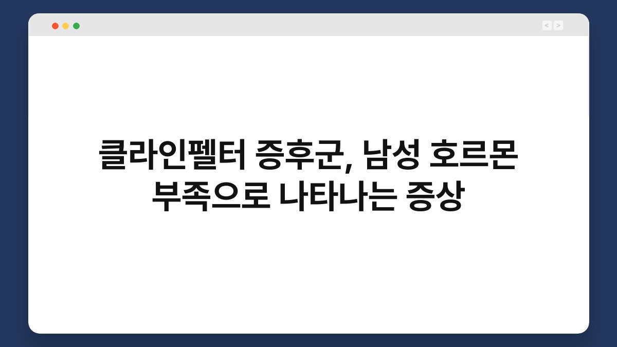 우리 몸은 복잡한 시스템으로 이루어져 있어요. 그 중에서도 호르몬은 우리의 건강과 기분에 큰 영향을 미치죠. 특히 클라인펠터 증후군은 남성 호르몬 부족으로 다양한 증상을 초래할 수 있는 질환입니다. 오늘은 이 증후군이 어떤 증상을 유발하는지, 그리고 어떻게 대처할 수 있는지에 대해 알아보겠습니다. 이 글을 통해 클라인펠터 증후군에 대한 이해를 높이고, 혹시나 자신이나 주변인에게 해당 증상이 나타난다면 어떻게 해야 할지 고민해보는 기회를 가져보세요.